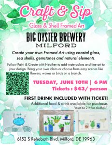 Create your own Framed Art using coastal glass, sea shells, gemstones and natural elements. Follow Paint & Create with Heather to add watercolors and line art to your design. Bring your own ideas or choose from easy scenes like flowers, waves or birds on a branch. First drink included with tickets. Additional food and drinks available for purchase. Must be 21+ for alcohol.