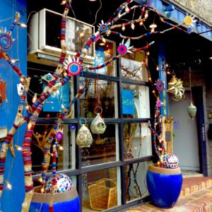 Jewelry made using imagery, gemstones, and crystal beads, with designs influenced by natural elements, such as the nautilus, leaves, and feathers.